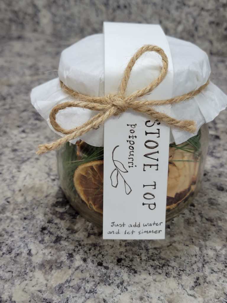 I am having fun making stove top potpourri this year! It not only smells good but it looks pretty too! Potpourri is also a fun, not so common gift. If you are using it as a gift then you will want to use all dried ingredients. Fresh ingredients are perfect for using at home. This is what I put in the potpourri pictured above: